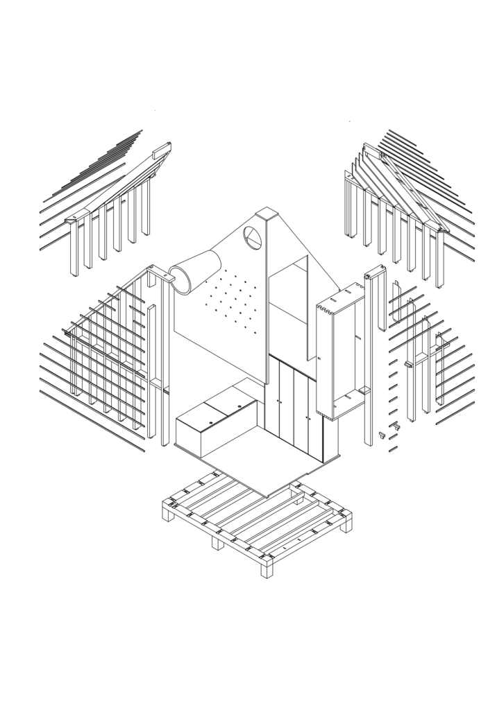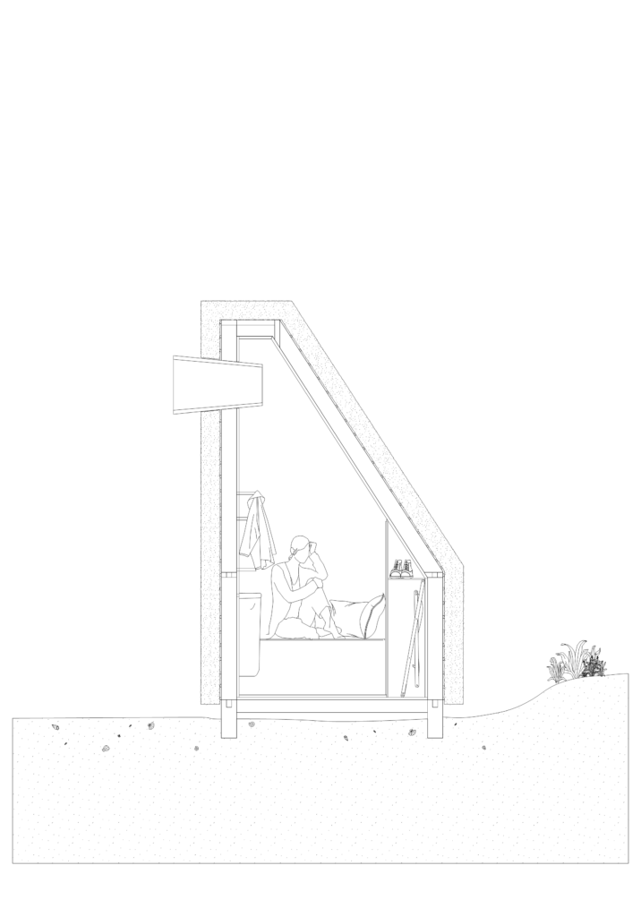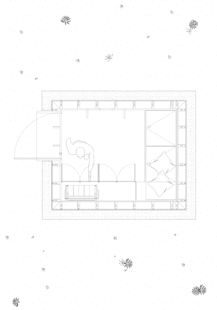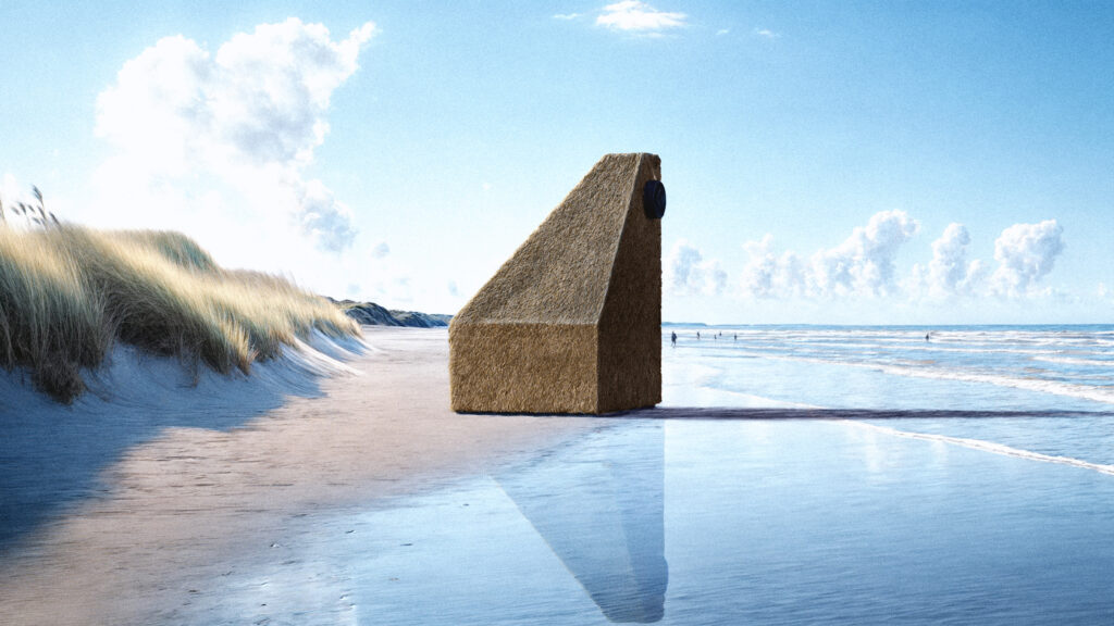 Placée sur la plage, non loin des vagues, la cabine capte et met en scène un paysage sonore en perpétuel mouvement. Les parois intérieures, par leur géométrie permettent une diffusion homogène des sons extérieurs, rendant l’espace plus réceptif aux vibrations de la mer. L’intérieur devient un instrument de perception, un amplificateur d’écoute. Le vent qui s’engouffre dans les interstices, le ressac des vagues, les variations de l’air, tout concourt à faire de ce lieu une expérience immersive. Chaque son est perçu dans sa texture la plus fine. Le silence ici n’existe pas, il est habité, vibrant, modelé par le dialogue incessant entre la cabine et la mer. Une connexion sensorielle qui se veut comme une invitation à se déconnecter des tumultes modernes.