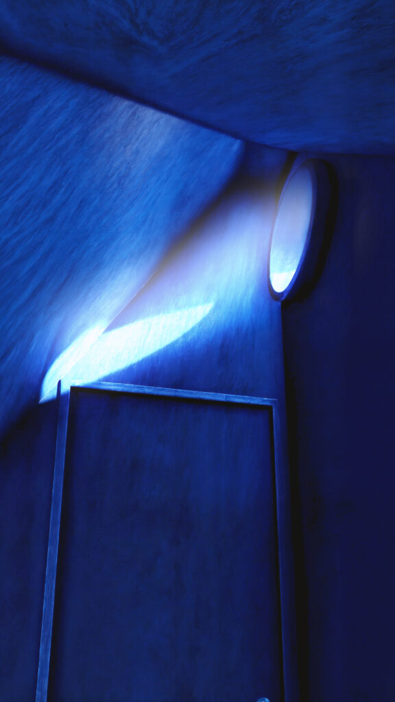 L’intérieur est baigné de teintes bleues, rappelant l’horizon marin. Cette couleur réduit le stress et favorise un sentiment de sérénité, tandis que la lumière filtrée accompagne les fluctuations sonores. Chaque détail est pensé pour amplifier l’immersion : le sol légèrement surélevé accentue la sensation de flottement, les matériaux absorbants modulent les fréquences, offrant une écoute douce et enveloppante. L’équilibre entre design et fonctionnalité reflète une volonté de créer un lieu simple mais essentiel, où chaque détail contribue à une expérience immersive.