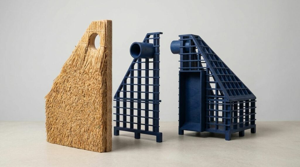 Construite avec des matériaux naturels bio et géo-sourcés – bois, paille –, cette cabine s’inscrit dans une démarche d’éco-construction ancrée dans les savoir-faire locaux de Normandie. Chaque matériau utilisé témoigne d’un dialogue harmonieux entre l’homme et son environnement. En valorisant ces ressources régionales, le projet soutient les filières artisanales et réaffirme l’importance des pratiques de construction respectueuses de l’environnement. La structure bois a été pensée et dimensionnée pour être assemblée avec le minimum d'éléments (assemblages par tenon mortaise), la couverture en chaume (issue de réemploi) a été choisi pour ses qualités acoustiques et sensorielles.