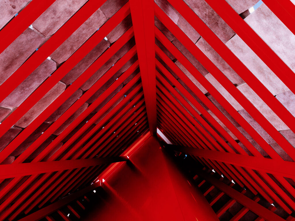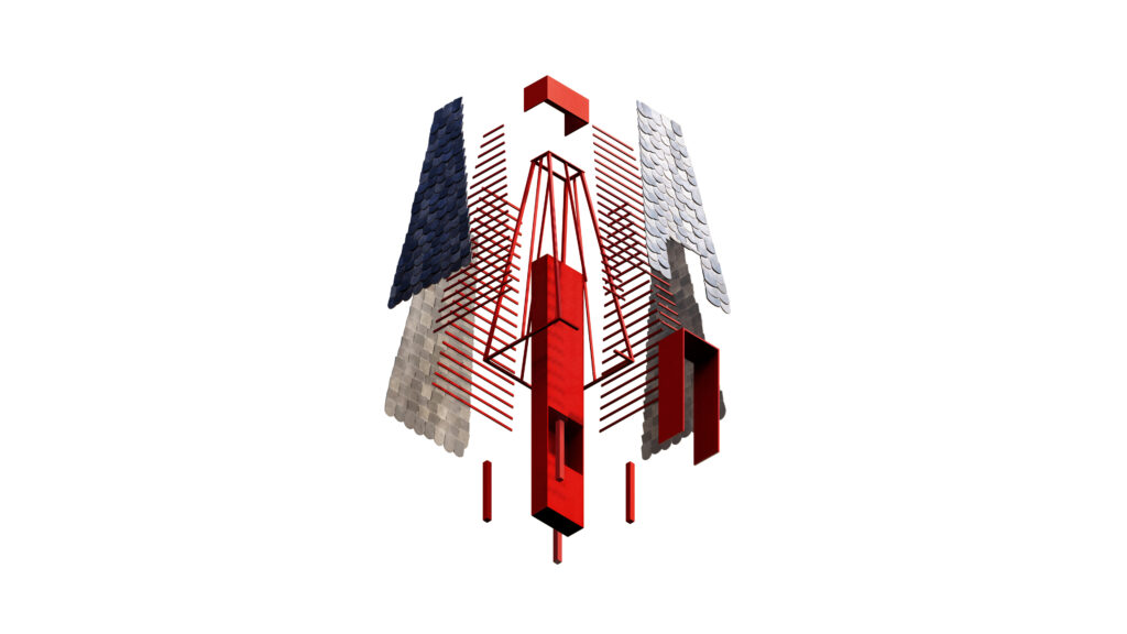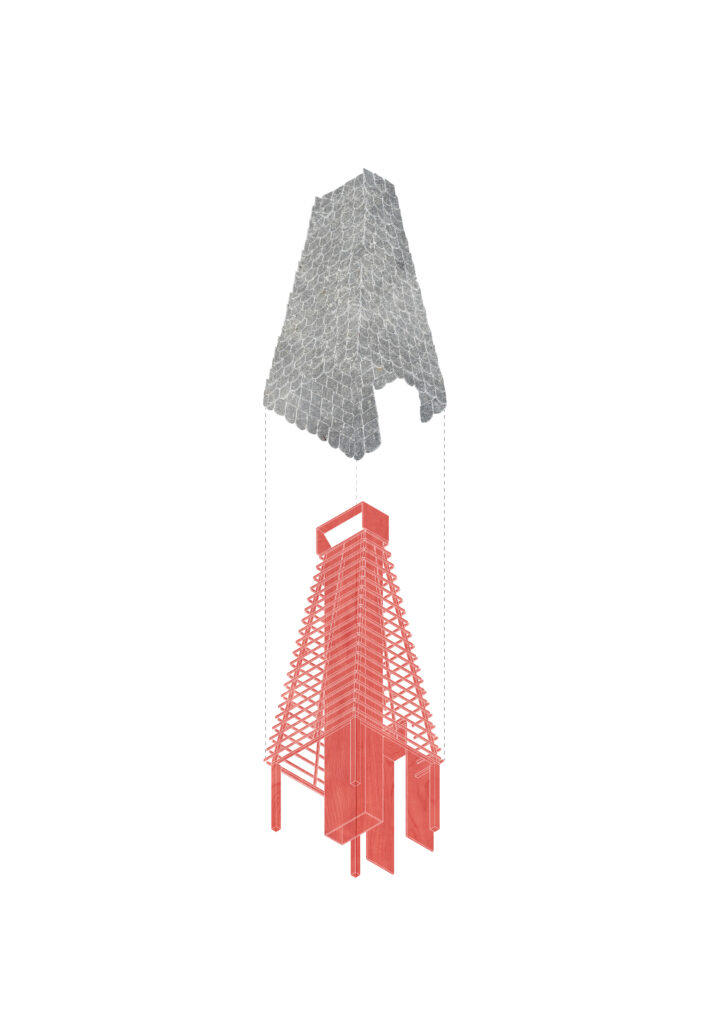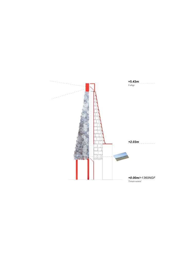 Ni tour ni belvédère, mais un instrument d’attention — un périscope habitable. Sa structure de bois rouge s’ancre dans la terre, son enveloppe de lauzes capte la lumière du ciel. Entre les deux, une respiration s’installe : celle d’un regard qui s’accorde au monde. Ici, voir ne signifie pas s’imposer. Du latin videre, percevoir par la vue, être témoin, remarquer, examiner — le verbe désigne moins un acte de possession qu’une disposition à l’attention. Voir, c’est discerner, mais aussi accueillir. La vision n’est pas un point de vue : c’est un espace de réciprocité. Le périscope renverse la logique du surplomb : il détourne la vue directe, la plie, la redirige. Il oblige à une position active, à un ajustement. Le massif ne se donne pas tout entier ; il se laisse percevoir par fragments, selon la lumière, la saison, la présence du corps. À l’intérieur, la pénombre prépare la vision. Les parois rouges absorbent et diffusent la lumière comme une rétine. Le regard se concentre, s’accorde au rythme lent du paysage. Par l’ouverture du périscope, l’horizon apparaît — renversé, suspendu, presque intérieur. Ce que l’on voit n’est pas le lointain, mais le mouvement du monde qui vient vers nous. Cette œuvre propose une véritable écologie du regard : une manière d’habiter la vision plutôt que de l’exploiter. Le regard devient milieu, non instrument. Voir devient un geste réciproque : on regarde, mais on est aussi regardé — par la lumière, la montagne, le temps. La matérialité incarne cette tension. Les lauzes sombres de l’enveloppe font écho aux toitures traditionnelles des burons d’estive : mémoire géologique et pastorale réinterprétée dans une architecture légère. Le bois peint en rouge, issu de matériaux de réemploi, ne se veut pas flamboyant mais signalé : il attire l’œil sans dominer, manifeste une présence discrète mais consciente — celui qui regarde est aussi visible. La rencontre de ces deux matières fait tenir ensemble deux rythmes du monde : l’immédiateté du vivant et la durée géologique. Entre ciel et sol, la construction agit comme un seuil.