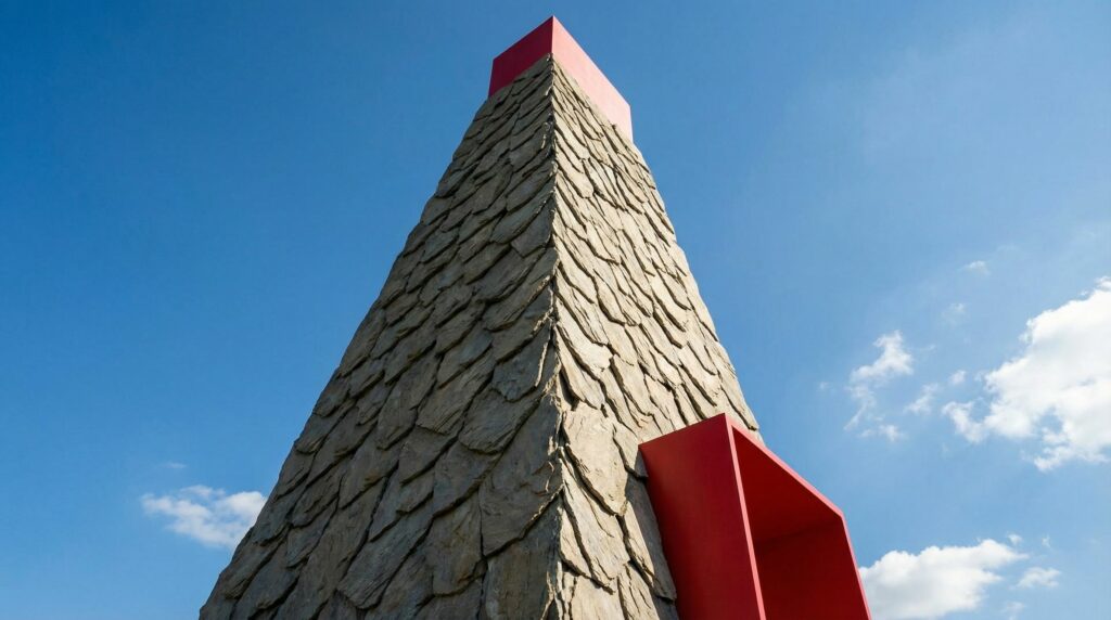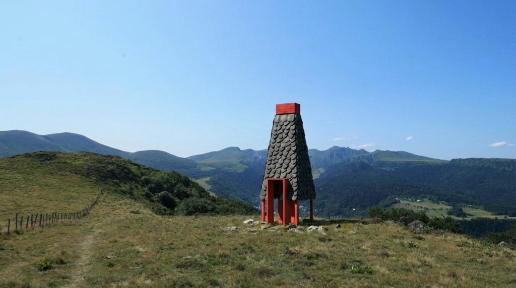 Ni tour ni belvédère, mais un instrument d’attention — un périscope habitable. Sa structure de bois rouge s’ancre dans la terre, son enveloppe de lauzes capte la lumière du ciel. Entre les deux, une respiration s’installe : celle d’un regard qui s’accorde au monde. Ici, voir ne signifie pas s’imposer. Du latin videre, percevoir par la vue, être témoin, remarquer, examiner — le verbe désigne moins un acte de possession qu’une disposition à l’attention. Voir, c’est discerner, mais aussi accueillir. La vision n’est pas un point de vue : c’est un espace de réciprocité. Le périscope renverse la logique du surplomb : il détourne la vue directe, la plie, la redirige. Il oblige à une position active, à un ajustement. Le massif ne se donne pas tout entier ; il se laisse percevoir par fragments, selon la lumière, la saison, la présence du corps. À l’intérieur, la pénombre prépare la vision. Les parois rouges absorbent et diffusent la lumière comme une rétine. Le regard se concentre, s’accorde au rythme lent du paysage. Par l’ouverture du périscope, l’horizon apparaît — renversé, suspendu, presque intérieur. Ce que l’on voit n’est pas le lointain, mais le mouvement du monde qui vient vers nous. Cette œuvre propose une véritable écologie du regard : une manière d’habiter la vision plutôt que de l’exploiter. Le regard devient milieu, non instrument. Voir devient un geste réciproque : on regarde, mais on est aussi regardé — par la lumière, la montagne, le temps. La matérialité incarne cette tension. Les lauzes sombres de l’enveloppe font écho aux toitures traditionnelles des burons d’estive : mémoire géologique et pastorale réinterprétée dans une architecture légère. Le bois peint en rouge, issu de matériaux de réemploi, ne se veut pas flamboyant mais signalé : il attire l’œil sans dominer, manifeste une présence discrète mais consciente — celui qui regarde est aussi visible. La rencontre de ces deux matières fait tenir ensemble deux rythmes du monde : l’immédiateté du vivant et la durée géologique. Entre ciel et sol, la construction agit comme un seuil.