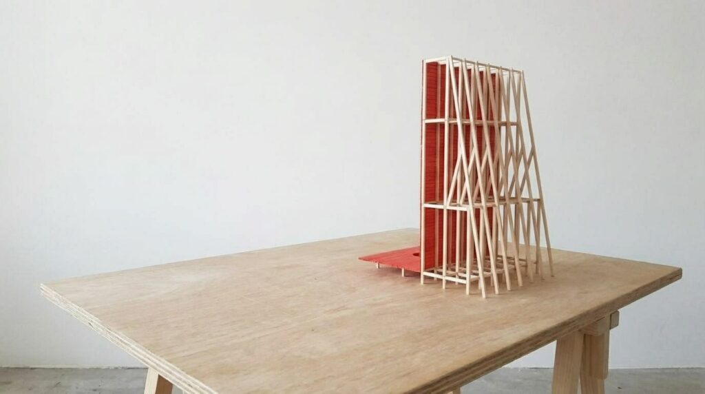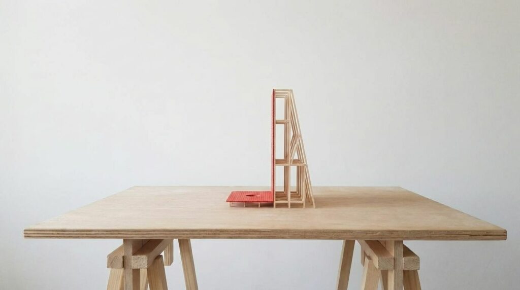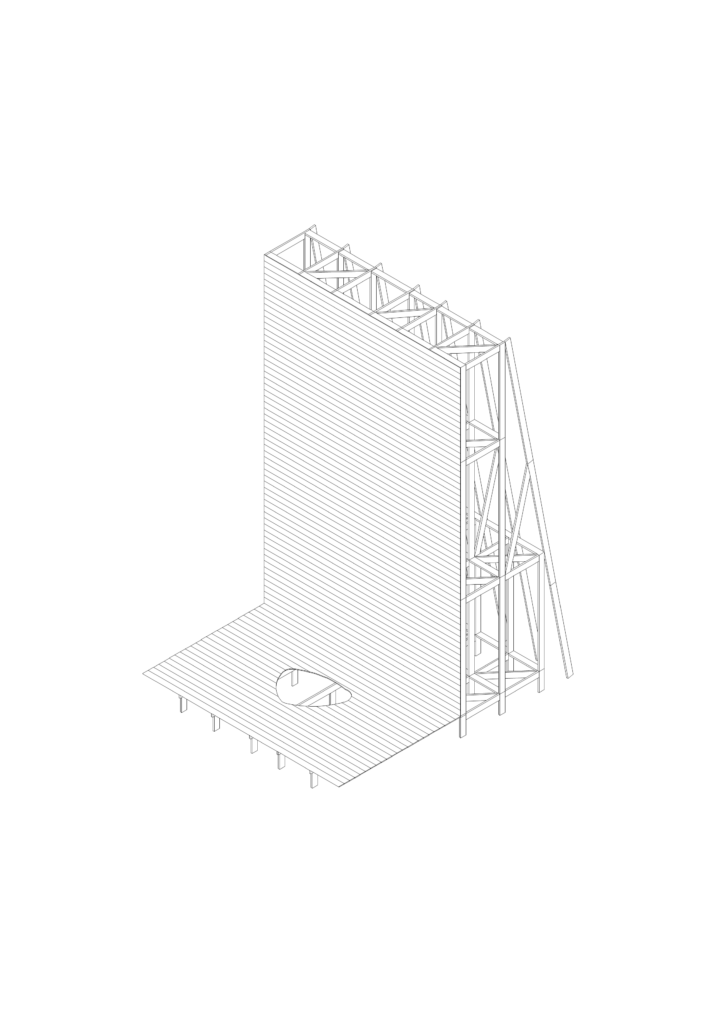 La matérialité suit cette exigence de discrétion : une structure légère, réversible, un bois peint, des ancrages minimes, un socle affleurant le sol pour ne pas heurter les racines ni gêner les animaux. Le projet appartient plus au régime du presque-rien qu’à celui de la construction. Il pourrait disparaître sans trace ; son rôle est d’avoir ouvert, le temps de sa présence, une autre manière d’habiter le regard.