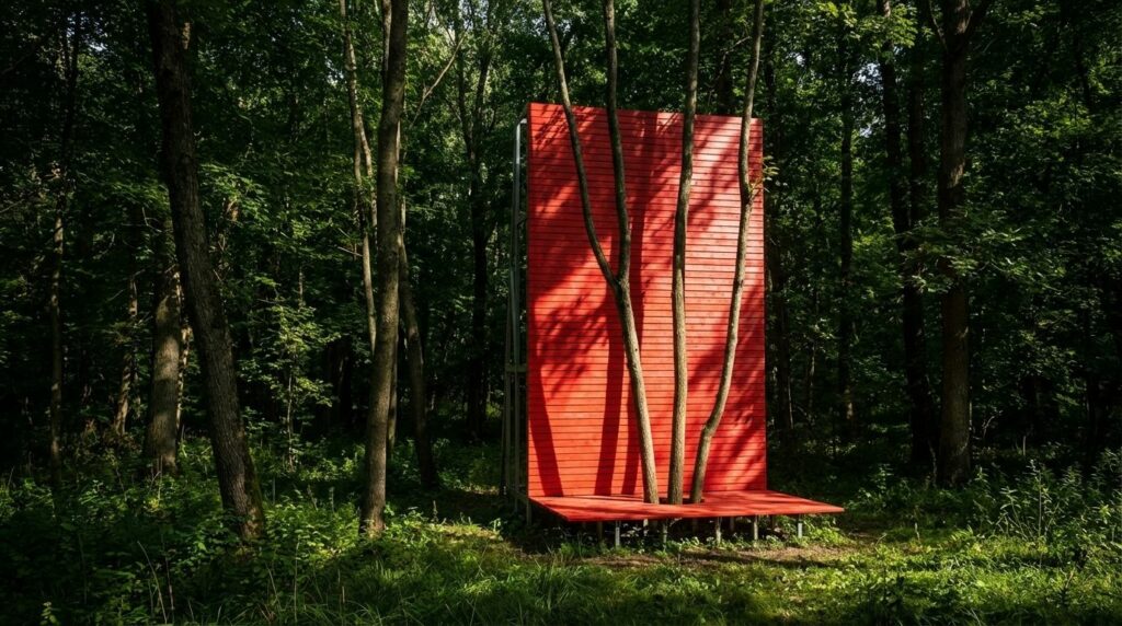 La couleur rouge, ici, n’est pas utilisée comme signal. Elle accueille la lumière, reçoit les ombres, révèle les variations du sous-bois. Elle agit comme une matière sensible. Les troncs qui traversent la plateforme se détachent devant le plan, leurs troncs s’inscrivent comme des figures, leurs mouvements se lisent dans les modulations du rouge, leurs mouvements sont perceptibles. Ce qui est montré n’est pas l’arbre en soi, mais l’apparition de l’arbre.