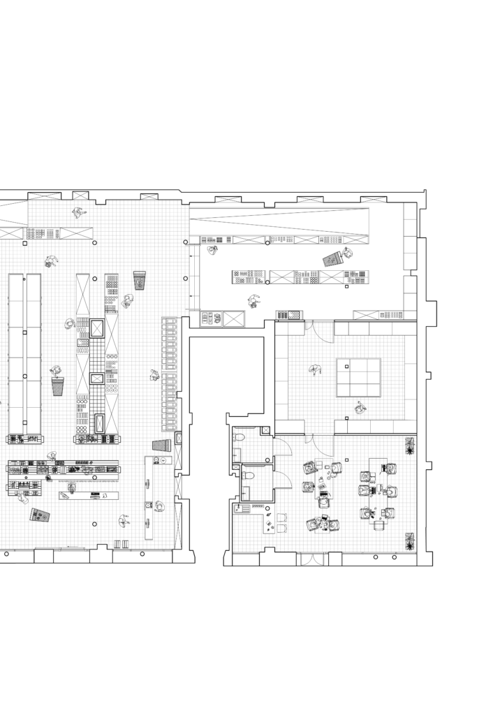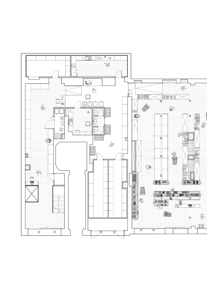 Le projet développé pour le Supercafoutch consiste en la conception et la mise en place d’un dispositif spatial destiné à accompagner les usages d’un supermarché participatif et coopératif. Il s’agit moins de transformer radicalement le lieu que de proposer des ajustements architecturaux capables de soutenir son fonctionnement collectif et évolutif. Le Supercafoutch, par son modèle, repose sur une organisation horizontale et une implication directe de ses usagers. Cette dynamique produit un espace en constante transformation, où les usages, les circulations et les modes d’occupation ne cessent d’évoluer. L’enjeu du projet est d’intervenir sans figer cette vitalité, en développant des structures capables d’absorber ces variations.