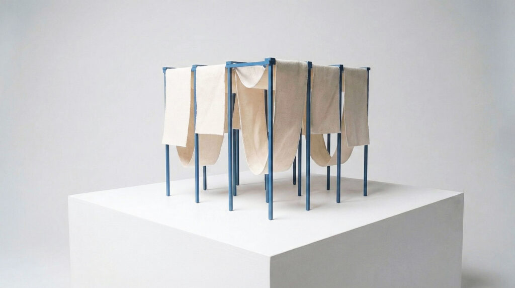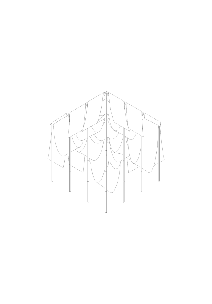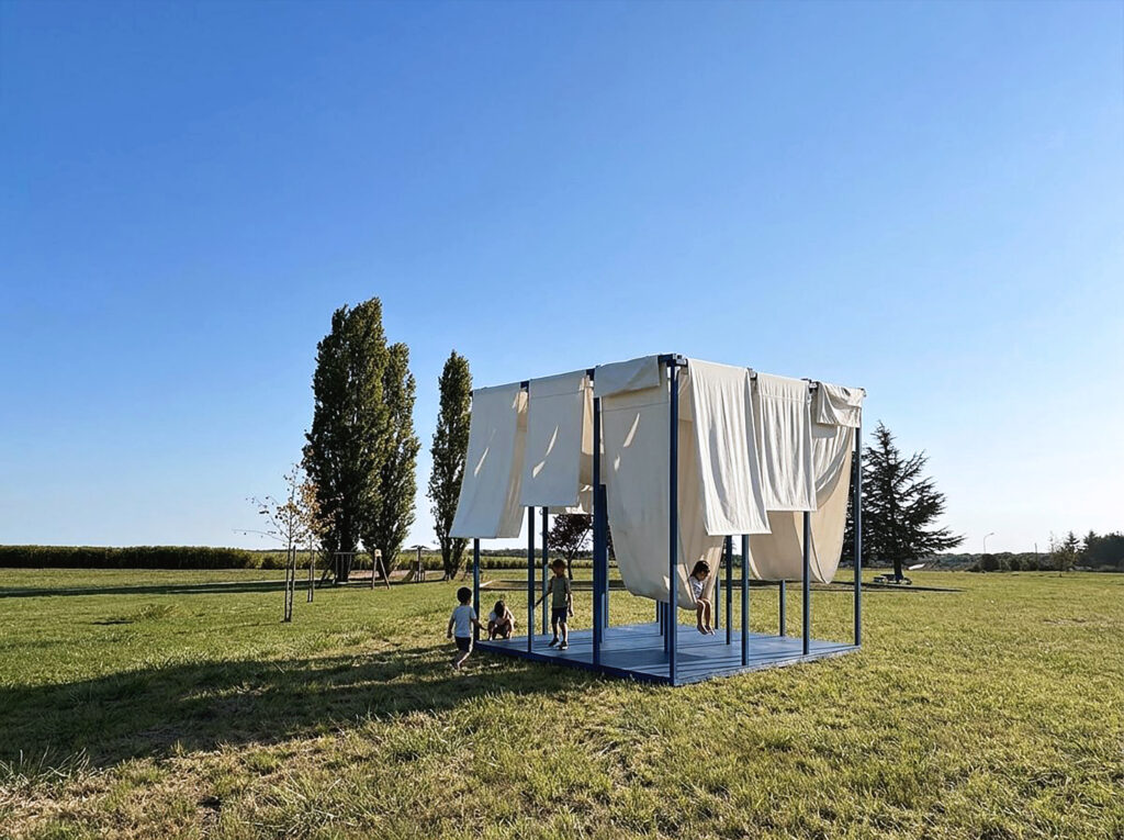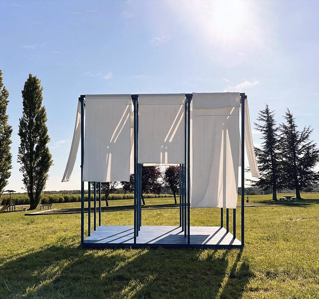L’œuvre prend la forme d’une structure légère en bois de réemploi, sur laquelle sont suspendus des pans de textile. Ces matériaux s’inscrivent en résonance directe avec le territoire de Troyes Champagne Métropole et ses filières historiques, tout en affirmant une démarche écologique et réversible. Pensée comme une installation provisoire, la structure est simple, démontable et respectueuse du site. L’ensemble ne délimite pas un espace fermé. Il forme une trame ouverte, poreuse, sans façade ni entrée principale. Le paysage traverse l’œuvre autant que l’œuvre s’inscrit dans le paysage. Le vent anime les tissus, la lumière les transforme, les ombres se déplacent au sol. L’intervention n’ajoute pas un objet spectaculaire au site : elle agit comme un filtre, révélant les qualités déjà présentes du lieu sans le transformer. Le textile joue un rôle central. Suspendu librement, il fragmente les vues, adoucit la lumière et rend perceptibles les mouvements de l’air. Le paysage apparaît par fragments, dans une succession de situations sensibles. Le regard ralentit, se déplace, s’ajuste. L’installation est également manipulable. Les pans de tissu peuvent être déplacés, relevés ou abaissés par les usagers. Ils deviennent tour à tour protections contre le soleil, zones d’ombre, appuis ou assises souples. L’œuvre ne se fige pas : elle évolue avec les gestes de ceux qui l’habitent. Elle fonctionne avec les gens.